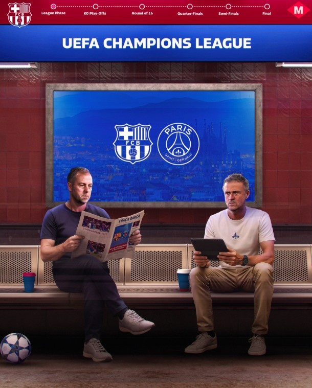 10月1日讯 巴萨发布欧冠对阵巴黎海报,两队主西席出镜亮相。