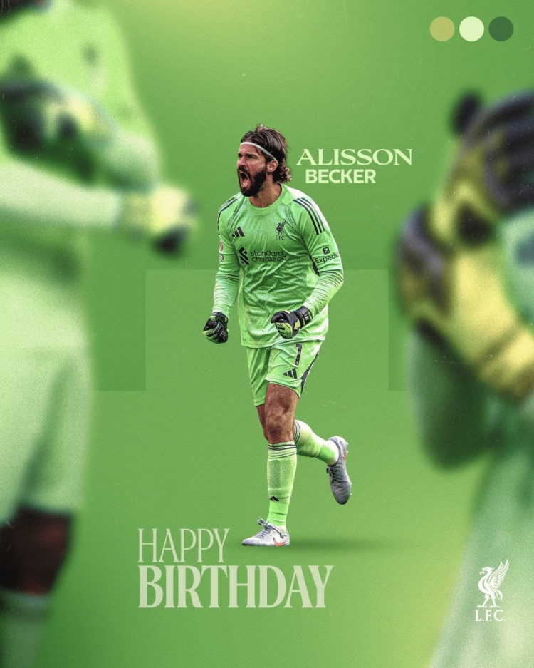利物浦官方社媒晒出为阿利森制作的诞辰海报,配文:“诞辰景观,阿利森。”