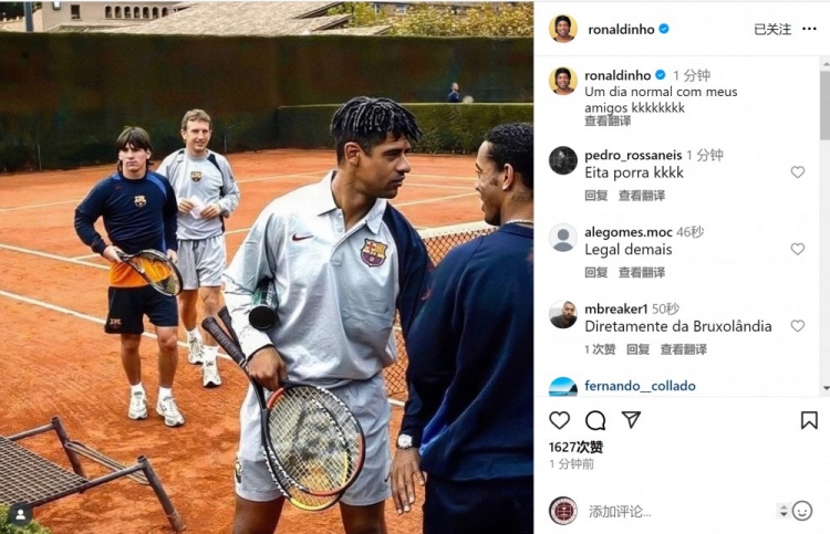 罗纳尔迪尼奥社媒晒出效率巴萨时辰与里杰卡尔德、梅西、罗卡(助教)一皆打网球的相片,配文:“与一又友们渡过的平庸一天,哈哈哈。”