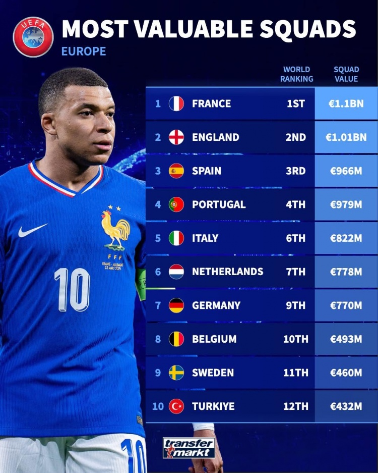 10月12日讯 德国转会阛阓网近日更新欧洲国度队身价排行,法国队以11亿欧元总身价高居榜首,英格兰(10.1亿欧)与葡萄牙(9.79亿欧)分列二、三位↓(转会阛阓图片中将西班牙与葡萄牙标反,应为葡萄牙第三、西班牙第四)