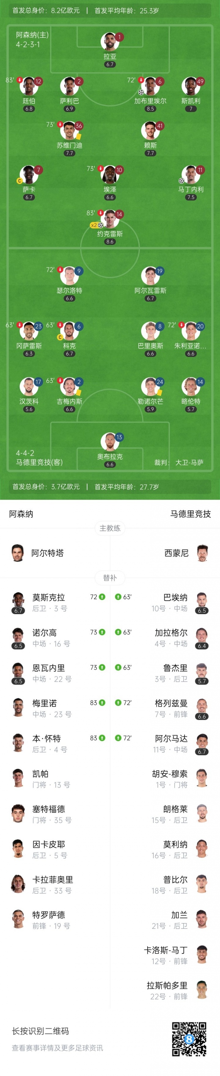 10月22日讯 马竞本轮0-4遭阿森纳横扫,西蒙尼在第63分钟作念了一次连换3东说念主的相同,巴埃纳、加拉格尔、鲁杰里上场,换下吉梅内斯、冈萨雷斯和科克。