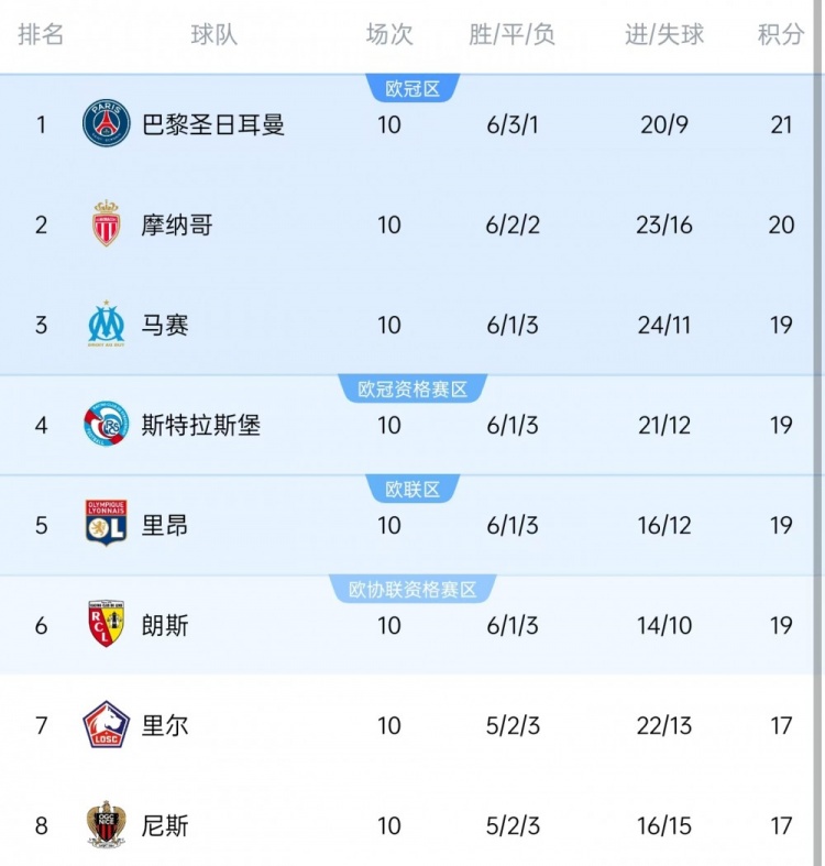 10月30日讯 法甲战罢10轮,巴黎积21分名次首位,但只跨越第6名朗斯2分。