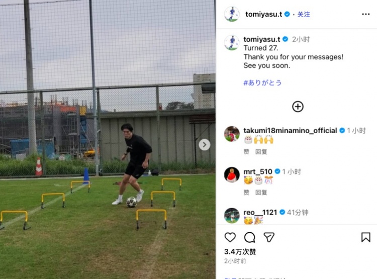 富安健洋写谈:“27岁了。感谢诸位的道贺!咱们很快就会重逢。”