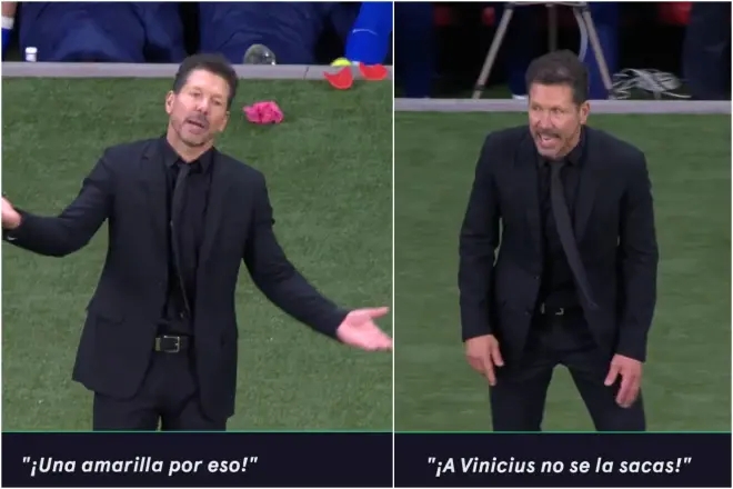 在一次犯规判罚之后,镜头拍到了马竞主帅西蒙尼正在对主裁曼萨诺抗议:“嘿!你在吹什么!安谧点!就为了这个出牌?”西蒙尼终末又摇着头说:“你不敢对维尼修斯出牌。”然后他又盯着第四官员肖似了一遍这句话。