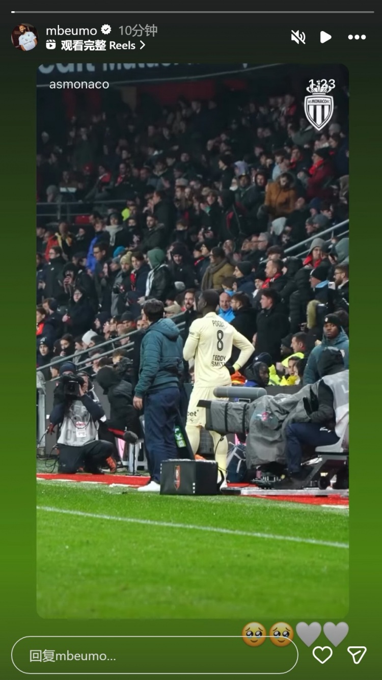 曼联前卫姆伯莫更新社媒动态,转发博格巴替补出场的视频,道喜他重返赛场。
