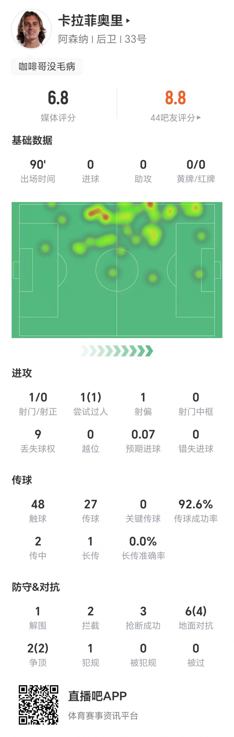 赛后技能统计数据表现,卡拉菲奥里1射零正,传球得手率92.6%,1次突围,两次阻碍,3次抢断,6次大地抗击得手4次,两次争顶一起得手,获评6.8分。