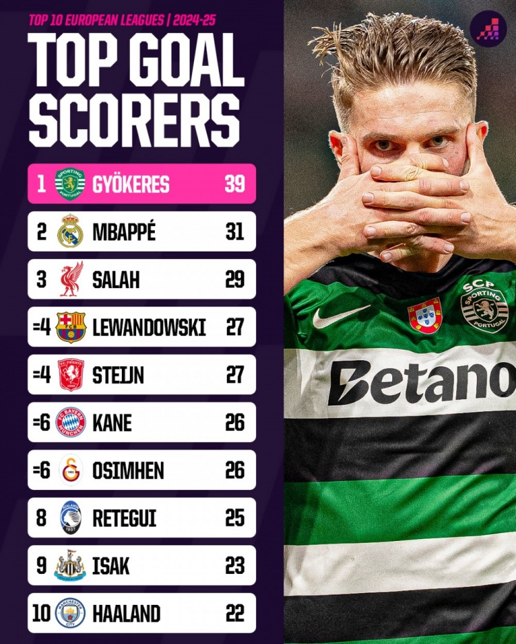 7月23日讯 约克雷斯转会阿森纳已无穷接近官宣,枪手终于获取了这台来自葡超的进球机器。据Opta数据统计,上赛季欧洲10大联赛弓手榜中,约克雷斯以39球高居榜首,姆巴佩31球排行第2。