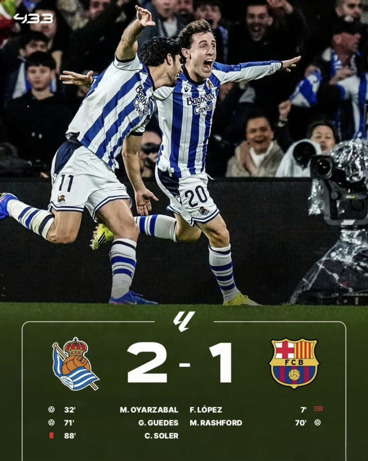北京技术1月19日04:00,西甲联赛第20轮,皇家社会在主场阿诺埃塔通顺场迎战巴萨。上半场32分钟奥亚萨瓦尔进球,巴萨费尔明、德容、亚马尔三球被吹,亚马尔点球也被取消。半场章程,皇家社会1-0巴萨。易边再战,奥尔莫、孔德中柱,拉什福德70分钟扳回一球,格德斯不到一分钟破门反超比分,久保建英伤退,索莱尔飞铲佩德里直红。最终皇家社会2-1巴萨。积分榜方面,巴萨49分仅1分领跑西甲积分榜,皇家社会24分第八。与此同期,巴萨各项赛事11连胜中道而止。